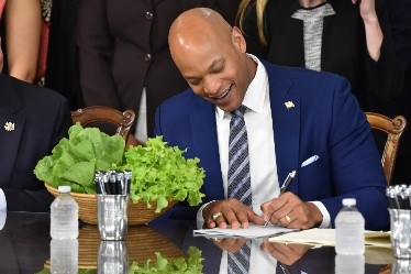 Gov. Wes Moore (D) signs the Chesapeake Bay Legacy Act on May 13, 2025, with a basket of greens brought by a Montgomery County farmer to celebrate the signing. (Photo by Bryan Sears/Maryland Matters)